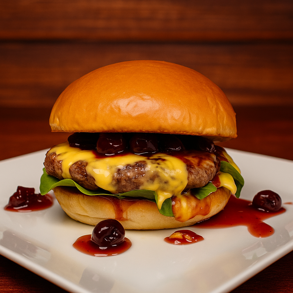 لحم برغر 150غ، خس فرنسي، جبنة شيدر، صوص كرز، مخلل